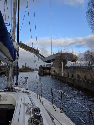 Weiter geht es. Ich habe noch ein Thermounterhemd ins Ensemble eingefügt, trotzdem ist mir kalt. Schließlich komme ich nach Leeuwarden. Also: fast. Ich fahre südlich der Stadt vorbei, um dann in einem Bogen von Westen in die Stadt rein zu fahren. Doch soweit kommt es nicht. In Friesland werden ja überall ständig Brücken für Segler geöffnet. Diese hier macht aber während der Rush-Hour von 16:00 - 18:00 nur für den Berufsverkehr auf. Ich kam dort um 16:30 an. Ohne die Rühreipause wäre ich durchgekommen. Was soll’s - kann ich nicht ändern. Ich lege also am Wartesteg vor der Brücle an und lege mich ein bisschen hin. Um 17:50 habe ich mir einen Tee gekocht (habe ich erwähnt, dass mir kalt war?) und ging ins Cockpit, um mich in Ruhe startklar zu machen. Doch was war das? Der Segler, der hinter mir wartete hatte schon losgemacht und dir Brücke zeigte rot-grün, das Zeichen, dass die Öffnung vorbereitet wird und man sich fertig machen soll. In einiger Entfernung von hintern kam ein Frachter an, der für diese Öffnung verantwortlich war. Ich startete also den Motor und gab leicht Gas nach vorne und ging zum Bug, um die Bugleine zu entfernen. Vorne war ich schon los, hinten aber noch nicht, als der Frachter viel schneller als ich erwartet hatte, auch schon da war. Und mit hoher Geschwindigkeit fuhr er ziemlich knapp an mir vorbei und saugte mein Boot förmlich an. Der Bug, der ja schon frei war, schwenkte um 90° in den Kanal - viel hat nicht gefehlt, und ich wäre mit dem Frachter zusammengestossen.